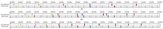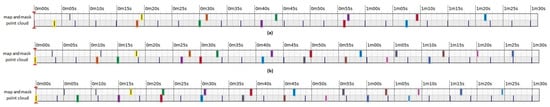 Figure 12 and Figure 13 show timetables with the output rates of the 3D point clouds, FEMs and FRMs using the previous and actual 3D scans, respectively. In these figures, different selection strategies have been employed by the Cloud_selector node. Processed 3D point clouds are colored and the same color is employed to indicate when its corresponding FEM and FRM have been obtained. Discarded 3D point clouds are not colored at all.