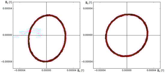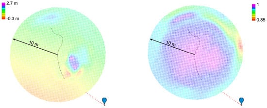 Details of leveled 3D laser scans obtained with a sensor’s head rotation of 180∘ (left) and 360∘ (right) while Andabata was moving along a slope.