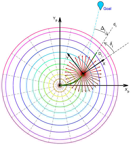 For distance r, ten uneven-distributed fuzzy sets have been defined over to provide higher detail for regions closest to the robot (see Figure 9). Concretely, peak parameter for are computed as: