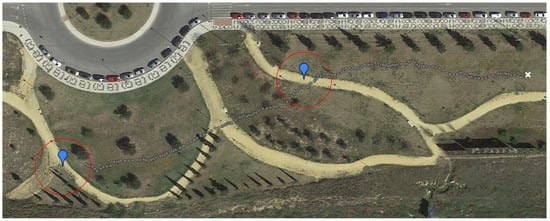 Navigation on natural terrains can be performed by following distant goal points given by their geographic coordinates [20,21]. These waypoints can be planned based on 2D terrestrial maps or aerial images [22], and represents the trajectory that, broadly, the vehicle should follow. However, to navigate between distant goal points, the robot must avoid local obstacles [23]. For this purpose, reactive navigation based on the evaluation of elementary movements in terms of the risks of traversing the terrain have been proposed [24,25,26].