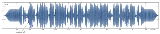 Here, it can be seen that the demodulated OFDM signal is exposed to a parasitic amplitude modulation when FM detector has a direct and strong delayed signal, which leads to the corruption of OFDM subcarriers’ orthogonality. The fragment of FM-OFDM symbol under the influence of strong reflected component of the signal () is shown in Figure 2. In that case, the sum of the direct and reflected signal is modulated on amplitude by the function :