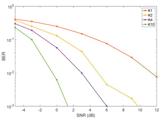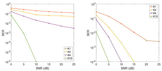 For the modes K1, K2, K4, and K10 (depending on the spectrum spread coefficient ) numerical simulations were made to estimate the dependence of total BER from SNR under AWGN on the input of FM demodulator. The BER values were measured without any noise-sustainable coding. The results of the modelling are presented in Figure 3.