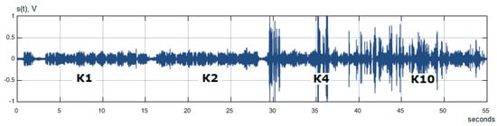 Time diagram of the recorded signals are shown in Figure 6. In the received signals, the presence of strong impulse noises, resulted by external factors and noises of vessel equipment, can be noted. Average recorded values of the SNR were 20 dB and higher.