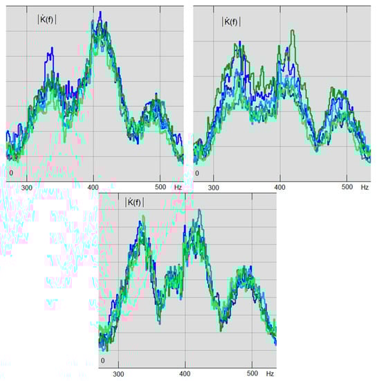 To estimate a channel dynamic all three fragments went through symbol-by-symbol estimation of amplitude-frequency response of the channel in the bandwidth of 300–500 Hz by point FFT comparison of transmitted and acquired signals. The dynamic of amplitude-frequency response of the channel for the first three 53 s fragments of data transmission is presented in Figure 7.