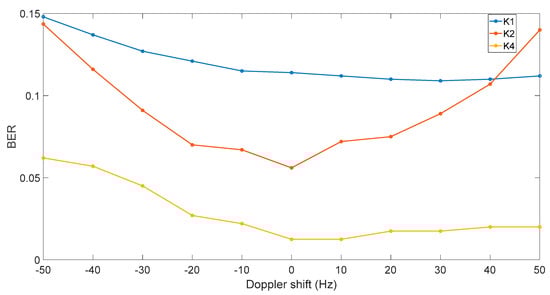 BER of received signals of K1, K2, and K4 modes under artificial Doppler shift adding.