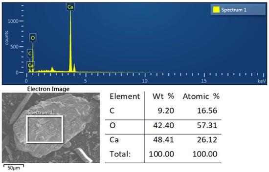 CHNS/O analysis, X-ray fluorescence (XRF), and energy-dispersive spectroscopy (EDS) were used to find out the precise values of calcium oxide (CaO), carbon (C), and oxygen (O), respectively, in the oyster shell powder (OSP) of Crassostrea gigas. The concentration of chemicals as per the test results is given in Table 2 and Figure 2. Calcium oxide was observed as the largest constituent at 99.033 wt % following by total oxygen at 34.023 wt %. Elemental analysis confirmed that shell powder is mainly composed of CaCO3, since the measured carbon content (12.072 wt %) is very close to its theoretical content (12.000 wt %). The remaining elements are sulfur trioxide (0.518 wt %), strontium oxide (0.311 wt %), and nitrogen (0.189 wt %). Ferric oxide (Fe2O3), cupric oxide (CuO), magnesium oxide (MnO), hydrogen (H), and sulfur (S) exist only in minor amounts. The raw material used in this experiment is a highly pure calcite, which is expected to influence the physical and rheological properties of asphalt cement when it is introduced into its matrix [3,4,39,40].