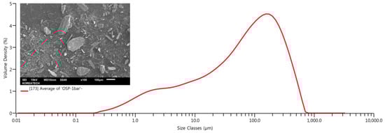 Figure 3 portrays a typical particle size distribution (PSD) histogram of oyster shell powder (OSP) obtained with dry ball grinding. As visualized in this Figure, the sample presents large PSD varying mainly between 111 µm and 211 µm, validating the SEM observation (i.e., powder particles with irregular shapes and different sizes). This behavior could largely be attributed to the higher hardness of the shells, because there is a higher content of calcite in the shells that increases the shell hardness and strength. Certain characteristic parameters representative of the distribution curve are summarized in Table 3. The size distribution data obtained from a laser diffraction measurement shows that Dv (50) is 71.10 µm, which represents 50% of particles that are below 71.10 µm (i.e., the median diameter). Similarly, Dv (10) and Dv (90) are 2.98 µm and 307 µm, indicating that 10% of particles are below 2.98 µm (i.e., fine fraction) and 90% of particles are below 307 µm (i.e., coarse fraction), respectively. It is generally recognized that the small particles have large, specific surface area (SSA) to interact with asphalt matrix and can be homogeneously dispersed in it, and the opposite is also true [41,42,43]. Usually, the mineral aggregates of road pavements are suspended throughout a mixture and vary in size from coarse to fine. Adequately compacted asphaltic mixtures generate a structure whose stiffness, stability, and wearing characteristics depend on the cohesiveness of the binder and the interlocking of the aggregates particles. Only the fraction of the mineral filler composed of particles thicker than the asphalt film contributes to the aggregate interlocking. The other fraction of the filler, i.e., the fine particles smaller than the thickness of the asphalt film, is distributed in the asphalt phase and is part of the binder component of the mixture [44].
