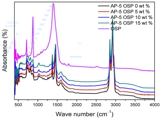 FT-IR spectra of OSP, neat asphalt, and OSP-filled asphalts.