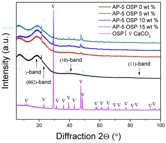 X-ray diffraction (XRD) patterns of OSP, neat asphalt, and OSP-filled asphalts are shown in Figure 5. Oyster shells are biological wastes, which are mainly made up of calcium carbonate (≥96 wt %) and minor amounts of other minerals. It can clearly be seen that the major crystalline phase of oyster shell waste is calcite (i.e., CaCO3). No peaks due to other phases were detected, indicating the high purity of raw material understudy. X-ray diffraction of neat asphalt sample (AP-5 OSP 0 wt %) was analyzed and the diffractogram is presented in Figure 5. Figure 5 shows that most of the peaks appear at around 2θ value of 20° and 25°. The γ-peak, which occurs at approximately 2θ = 20°, mirrors the packing distance of saturated structure that comes from the X-rays scattered by the aliphatic chains or the condensed naphthenic rings. It has been reported that this band arises principally from paraffins order [47]. The (002) peak or graphene peak, which appears at about 2θ = 25°, is due to the diffraction of X-rays from the stacks of aromatic sheets. The (10) and (11) peaks, or (100) and (110) reflections, originate from the in-plane structure of the aromatic molecules. They refer to the first and second nearest neighbors in the ring compounds. Generally, the size of an aromatic sheet is often determined from the (10) peak (2θ = 40°), and not from (11) peak, due to its very weak intensity [48]. It is widely known that when the peaks in the XRD patterns are broader, the more short range exists in that structure type. This case comprises the unfilled and OSP-filled asphalts. On the other hand, when the XRD pattern peaks are sharper and narrower, the more highly crystalline phase with high degree of long-range order exists. The oyster shell powder meets this criterion. As demonstrated by XRD patterns, with the increase in OSP dosage from 5 to 15 wt %, the intensity of the CaCO3 peaks gradually increased without affecting the XRD profile of the base bitumen. This suggests that OSP exists stably in the binder structure, which means that its addition did not cause any change in the crystalline phase of bitumen (governed chiefly by asphaltene compound). Accordingly, it can be assumed that the OSP has no chemical reaction in the asphalt system and exists independently with only filling effect.