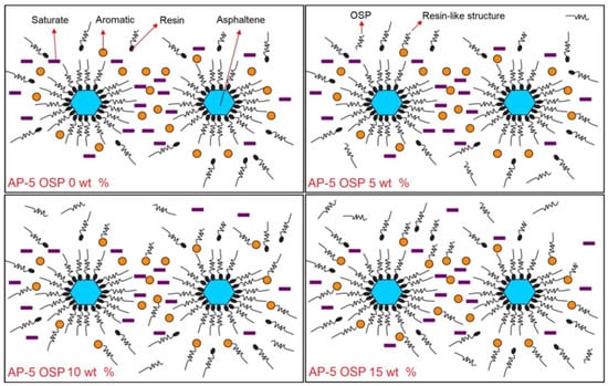 To gain deeper insight into the impact of oyster shell powder (OSP) on the composition of asphalt cement, this latter was divided into SARA (i.e., saturates, aromatics, resins, and asphaltenes) fractions by using standard procedure based on adsorption chromatography (e.g., TLC-FID) [32]. Figure 6 pinpoints the distribution of SARA type hydrocarbons in the base asphalt (i.e., AP-5 OSP 0 wt %) and asphalt treated with different proportions (e.g., 5, 10, and 15 wt %) of OSP. Curiously, it shows that the composition of asphalt changed after the addition of OSP. The fraction of aromatics components decreased; meanwhile, the fraction of resins increased. The remaining species such as saturates and asphaltenes did not undergo any significant changes. The changing of such composition fraction implies that the aromatics in lighter fractions of asphalt were more probably changed to resins. In other terms, it seems that the aromatics were selectively interacted with OSP surface [49,50] and readily converted into resin-like structures (see Figure 7). The oyster shell powder (i.e., CaCO3) with high calcium content is naturally hydrophilic material and tends to create strong bonds with hydrophobic organic compounds such as bitumen. The strong bonding between the calcite (mainly calcium sites) and adsorbate aromatic molecules most likely involved the carboxylic, hydroxylic, and amines groups; some van der Waals and electrostatic interactions may have also occurred [49,50]. This is a very interesting finding that necessitates further in-depth investigation.