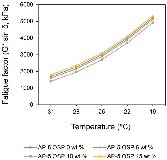 G*.sin δ is the fatigue cracking factor in the Superpave (i.e., Superior Performance Asphalt Pavement) binder Specification. Requirement to address fatigue cracking in Superpave binder specification is that G*.sin δ at 10 rad s−1 shall not exceed 5000 kPa [38]. Thus, low values of G* and δ are considered desirable attributes from the standpoint of resistance to fatigue cracking. The higher G*.sin δ value, the more fatigue cracking is susceptible the bitumen. Figure 10 displays the fatigue cracking performance of the base asphalt (i.e., AP5 OSP 0 wt %) and asphalts treated with different concentrations of OSP (e.g., 5, 10, and 15 wt %) under the PAV (i.e., pressure aging vessel) condition. The increasing trend of the master curve highlighted that the treated samples resist fatigue cracking from intermediate to lower temperatures (e.g., 31, 28, 25, 22, and 19 °C). The failure temperature was reached when the fatigue cracking parameter (G*.sin δ) exceeded 5000 kPa. From the foregoing data it is obvious that 15 wt % OSP exhibited G*.sin δ value of 5325 kPa, which failed at temperature of 19 °C. Also, the failure temperature of the base asphalt sample was attained at 19 °C, with G*.sin δ value of 5225 kPa. Similarly, failure temperature was observed on 5 wt % OSP-filled asphalt with a recorded G*.sin δ value of 5125 kPa. The optimum was reached only with 10 wt % OSP-filled asphalt sample, because it showed lower G*.sin δ value than the base asphalt and met the Superpave minimum requirement at 19 °C (G*.sin δ = 4925 kPa). It becomes clear that 10 wt % OSP exhibits higher resistance to fatigue cracking as compared with other OSP contents.