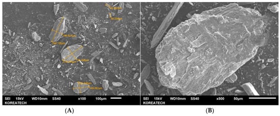 Scanning electron microscope (SEM) micrographs of oyster shell powder (OSP) obtained with dry ball grinding at different magnifications ×100 (A) and × 500 (B).