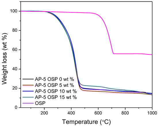 TGA thermograms of OSP, neat asphalt, and OSP-filled asphalts.