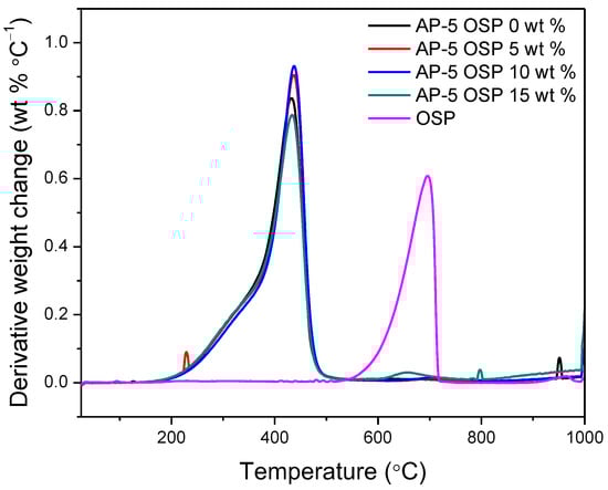 DTGA thermograms of OSP, neat asphalt, and OSP-filled asphalts.