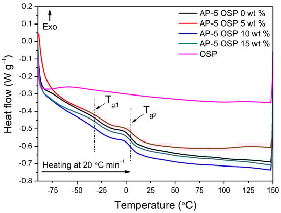 In inert atmosphere, some differences stand out. Figure 16 indicates that there is change in glass transition temperature (Tg) between unfilled and OSP-filled asphalt samples. This fact implies that the presence of OSP affected the Tg of asphalt to some extent. The DSC data of neat asphalt and OSP-asphalt mastics filled with various contents of OSP (e.g., 5, 10, and 15 wt %) are outlined in Table 6. The first glass transition peak temperature (Tg1) of OSP/asphalt composites was smaller than that of neat asphalt. As the filler content increased to 10 and 15 wt %, the Tg1 dropped from −26.70 (for neat asphalt: AP-5 OSP 0 wt %) to −28.91 °C and to −28.12 °C, respectively. However, the OSP/asphalt composite was also found to have a slightly higher glass transition peak temperature than the base asphalt. The temperature slightly rose from −26.70 °C to −25.61 °C with a filler dose of 5 wt %. The Tg, though, changed irregularly with the OSP content.