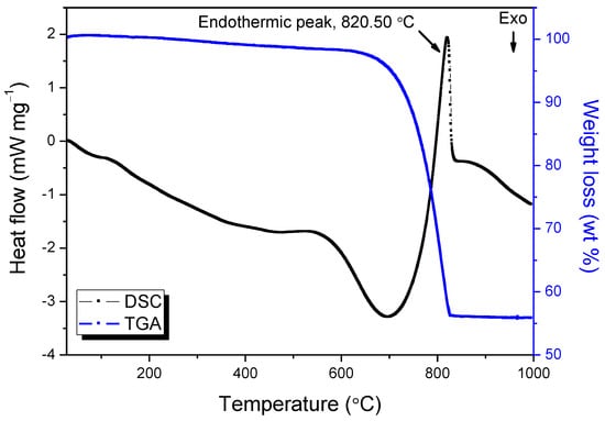 STA (TGA/DSC) measurement of OSP (sample mass 11.151 mg) in Alumina crucibles at a heating rate of 10 K min−1 in argon atmosphere (50 mL min−1).