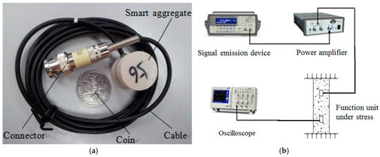 Figure 1a shows the smart aggregate employed in the proposed monitoring system, which was innovatively introduced by Song [8]. SA’s are generally utilized in pairs in SHM practice. According to the direct and inverse piezoelectric effect of inner piezoelectric patch, one SA works as a sensor and the other works as an actuator among the pair of SA’s, which constitute a representative function unit.