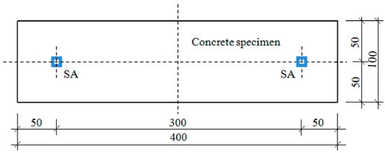 The concrete compositions are shown in Table 1. Commercial concrete supplied by Shenzhen Antuoshan Concrete Co. Ltd. (Shenzhen, China) is employed to fabricate the testing specimens, i.e., two concrete columns (C1 and C2), with the dimension of 100 mm × 100 mm × 400 mm. A pair of SA’s was embedded in designed locations of the concrete specimen when being fabricated (Figure 2). Besides, 15 cubic specimens with dimension of 100 mm × 100 mm × 100 mm were cast to measure the concrete compressive strength development versus time (Table 2).