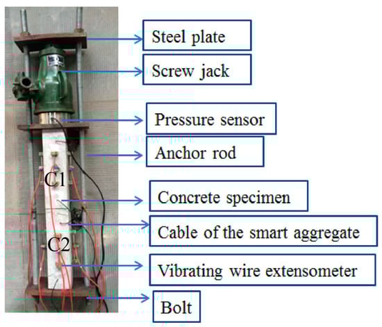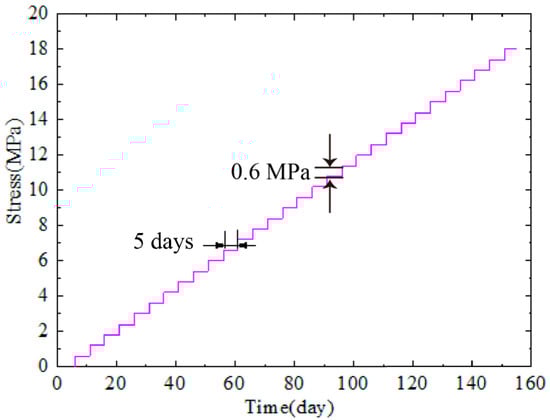 Figure 3 illustrates the loading devices. A screw jack with a maximum capacity of 500 kN was used to load the testing objects. A pressure sensor was employed to monitor the value of the applied load. C1 and C2 were superposed and subjected to stage loads. The ultimate strength of the prism (σmax) is approximately 0.78 times of the cubic compressive strength, i.e., 45.24 MPa [29,30]. The step load (6 kN) was first applied on the sixth day and applied at an interval of five days afterwards until the stress reaching 27 MPa, which equals to around 0.6σmax (Figure 4). That is to say, the load at each step was kept constant for five days. The baseline of the signal was collected before loading (zero stress state). Then, the aforementioned active monitoring procedures were performed state and at the day after loaded (ensuring mechanical state of the system kept steady) for each step load case. 60 kHz and 100 kHz harmonic voltage signals with amplitude of 10 V were used to activate the SA to obtain the amplitude information, and pulse drive signals with 5 μs plus width and voltage amplitude of 10 V were used to capture the velocity of stress wave.
