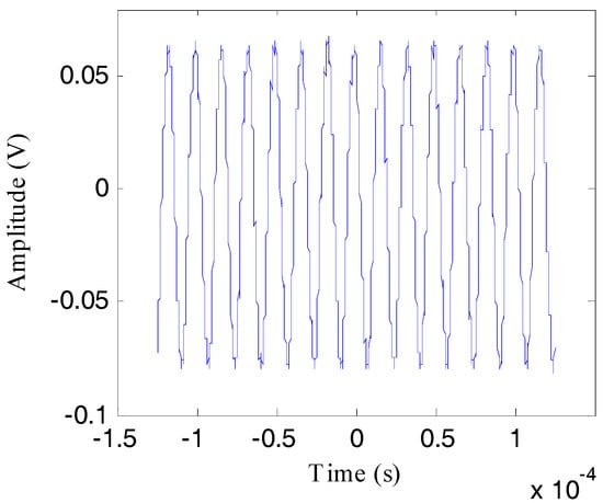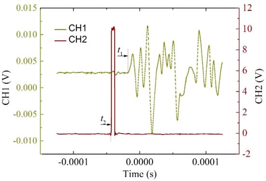 The selection of the frequency bandwidth was determined through test, which was consistent with that of previous research by Song on damage detection and concrete strength development monitoring [31]. It should be noted that the recorded signals (Figure 5) were dealt with adaptive threshold method in MATLAB to get rid of environmental noise [32]. Then the treated signal is further fitted as a sine function (see Equation (1)), and the parameter A is the amplitude of the signal. For velocity, the first arrival time method was used to determine the velocity of stress wave (Figure 6) [22] (see Equation (2)). Additionally, it is worth to mention that this test was carried out in HYHW-12A type walk-in chamber, in which the temperature and relative humidity was kept constant, with 20 °C and 60%, respectively.