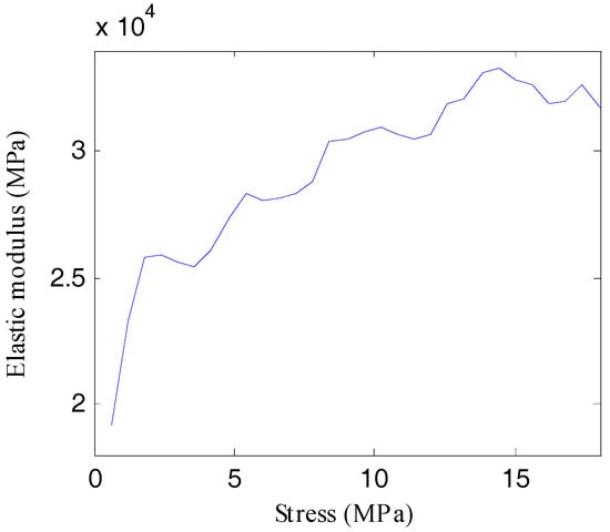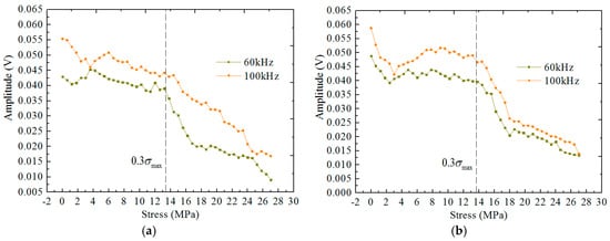 Figure 7 illustrates the amplitudes of received signals with different frequencies (60 kHz and 100 kHz). It is noticeable that the stage stress has a considerable influence on the amplitude of sensing signals for both frequencies. The amplitudes change non-monotonically with incremental stress. The amplitudes of response signals first decrease sharply for early steps of load, and then vary irregularly. It can be seen that a critical point occurred at a stress level of about 0.3σmax, where a sudden drop occurs to the amplitudes. An explanation is that apparent damage occurs after 0.3σmax. On the whole, the development of amplitudes of the stress wave versus incremental load showed a downward trend. According to previous research of Gu [9] and Equation (3) [9], provided that concrete is homogeneous material; the amplitude would decrease monotonously with the development of concrete strength and elastic modulus in unloaded state. This can be verified by Figure 8, which illustrates the elastic modulus development versus stress. It should be noted that elastic modulus after 18 MPa was not obtainable, since that plastic characteristic started to appear. Further, the elastic modulus values are only approximate values, which was obtained by non-standard test method. Noteworthy is the fact that concrete is a kind of heterogeneous material, especially in the hydration process. From the monitoring results, it can be seen that the effect of load on micro-crack propagation is quite evident in the early age of concrete. The amplitude of the harmonic stress wave can be expressed as
