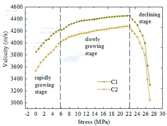 The first stage is rapidly growing stage (concrete age is before 36 days), in which the velocities rise from 3854 m/s (C1) and 3535 m/s (C2) sharply at early loading steps below 6 MPa stress state. In this stage, concrete is in its early age, when the cement hydration reaction takes place severely. It is obvious that the elastic modulus of concrete develops rapidly in the early-age and this leads to an increase in the velocity with the growth of elastic modulus, according to Equation (4) [33]. On the other hand, when the concrete is subjected to a step load, it undergoes elastic shortening and the subsequent creep strain. In this process, some of the pores or micro cracks perpendicular to step load are close, and the concrete becomes more compact, which is equivalent to the increase of modulus elasticity of concrete [18]. It can be concluded that both cement hydration and applied step load result in an increase in wave velocity, and this explains the reason of why the growth rate of velocity in first stage is larger than that of in second stage. The velocity is a function of elastic modulus, density, and Possion’s ratio in the following form