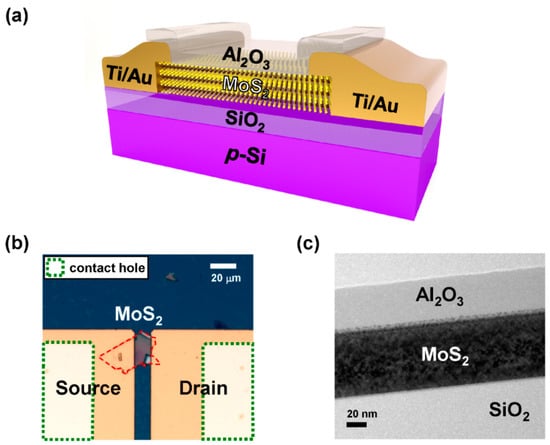 (a) 3D schematic structure of multilayer molybdenum disulfide (MoS2) thin-film transistor (TFT) passivated with aluminum oxide (Al2O3); (b) optical microscope and (c) cross-sectional transmission electron microscopy (TEM) images of the MoS2 TFT with Al2O3 passivation, respectively.