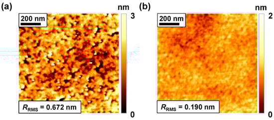 Atomic force microscopy (AFM) images of Al2O3 surfaces on MoS2 active channel: (a) without and (b) with ultraviolet-ozone (UV-ozone) treatment for 5 min before atomic-layer-deposited (ALD) procedure. RMS: root-mean-square.