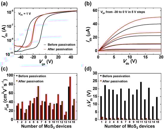Comparisons of (a) transfer and (b) output characteristics of MoS2 TFTs with respect to Al2O3 passivation. Variations of (c) field-effect mobility (μeff) and (d) threshold voltage (ΔVth) of 15 representative Al2O3-passivated MoS2 TFTs compared with those of pristine devices. All the Al2O3 layers were deposited after UV-ozone treatment.