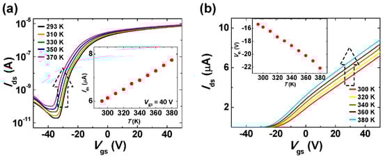 As shown in Figure 4, Ids increased with increasing temperature over the whole Vgs region. The results also confirmed the linear increment of the Ids values at a Vgs of 40 V with respect to 10 different temperatures, as shown in the inset of Figure 4a. From the transfer characteristic curves, we extracted the Vth at 10 different temperatures, which linearly shifted toward the negative Vgs region with increasing temperature (inset of Figure 4b).