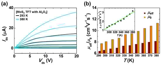 Figure 5b presents μeff and μ0 of the Al2O3-passivated MoS2 TFT at various temperatures, which were calculated from Equations (2) and (5), respectively. At all temperatures, the results showed that (i) all μ0 values were higher than μeff, indicating the existence of relatively high Schottky barriers and subsequent contact resistances in our devices; and (ii) both μeff and μ0 gradually increased with increasing temperature, which can be attributed to reduction of the contact resistance and increased thermionic emission due to high temperature [25,38]. The inset of Figure 5b presents the temperature-dependent variation of the difference between μeff and μ0 (Δμ), which shows linear response behavior with respect to temperature increase. The details of μeff, μ0 and Δμ are provided in Table 2.