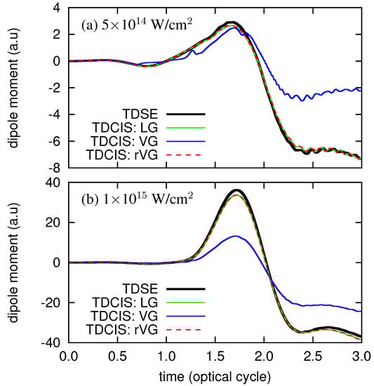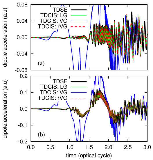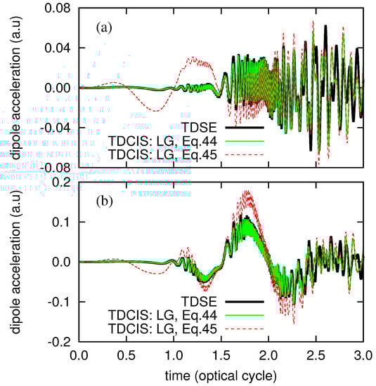 where for the 1D Hamiltonian. Numerically achieving the theoretical equivalence of Equations (44) and (45), even for the exact TDSE method, requires a simulation to be converged with respect to computational parameters (time-step size, etc.). Therefore, we first applied both Equations (44) and (45) in the TDSE simulation, and confirmed a perfect agreement (not shown), suggesting the convergence of the simulation. Then we compare the results of TDCIS in the LG, using Equations (44) (i.e., Equation (40) with ) and (45), with that of TDSE in Figure 2, clearly showing a better agreement of the results of the former approach with that of TDSE. From this result, and also by the fact that being based on Equation (44) guarantees that the high-harmonic generation (HHG) spectra obtained from the velocity and the acceleration , at the convergence, properly relate to each other [], we consider that Equation (44), together with Equation (40) or Equation (41), should be adopted as a consistent method for evaluating the dipole acceleration.
