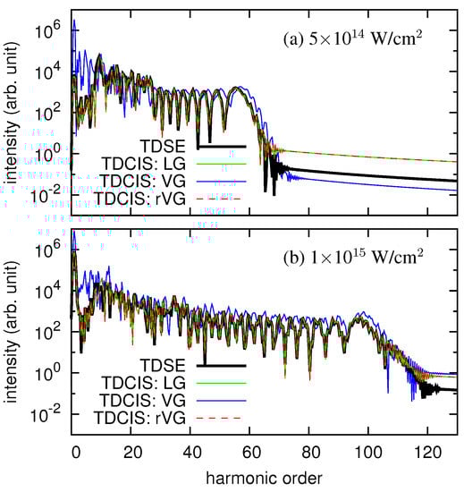 High-harmonic spectrum of 1D-He exposed to a laser pulse with a wavelength of 750 nm and an intensity of (a) 5 × 10 W/cm and (b) 1 × 10 W/cm. Comparison of the results with TDCIS in the LG, VG, and rVG with that of TDSE.