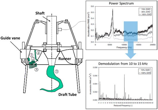 Two different high-frequency analysis techniques were used to detect erosive cavitation in the previous studies: analyzing the RMS (root mean square) value at high-frequency bands (over 10 kHz) and applying amplitude demodulation techniques, such as the Hilbert transform [25], to obtain the low-frequency oscillation of the cavitation cloud. Figure 1 shows an example of a prototype Francis turbine analyzed with the aforementioned technique. In this case, the power spectrum and amplitude demodulation of a high-frequency band (10–15 kHz) are shown for an accelerometer located in the turbine bearing. Three different operating conditions were analyzed: 70%, 85%, and 100% of the guide vane opening or the maximum power. It is observed than the amplitudes of the spectrum are higher for the 100% of the maximum power and lower for the 70% operating condition. Moreover, the main frequencies related with the rotating speed, RSI, and their harmonics are present when demodulating the signal for the case of 100% of the maximum power, whereas they are not seen in the 70% operating condition. After several hours of operation at 100% of maximum power, severe erosion damage was found in the blades, which was associated with unstable inlet leading edge cavitation.