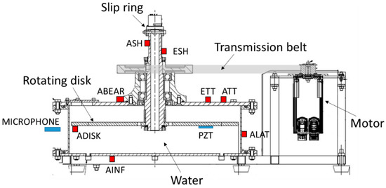 To measure the excitation and response of the rotating structures, the disk was instrumented with a miniature and submergible accelerometer (ADISK in Figure 2) (Dytran 3006-A, sensitivity: 100 mV/g) and the shaft with another accelerometer (ASH in Figure 2) (MMF Type KS91B, sensitivity: 10 mV/g) and an AE sensor (ESH in Figure 2) (Brüel and Kjaer Type 8313) (Brüel & Kjaer, Naerum, Denmark).