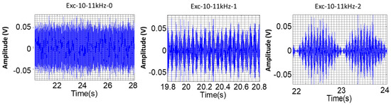 In order to represent in the present test rig the typical excitation of erosive cavitation in hydraulic turbines, different excitation patterns were applied to the disk using the PZT. In this case, a pseudorandom excitation in three different ranges of frequency was selected [36]: in the band 1–2 kHz (PS1), in the band 10–11 kHz (PS2), and in the band 20–21 kHz (PS3). Moreover, each one of these pseudorandom excitations was multiplied by a given low-frequency value in order to represent the low-frequency hydraulic phenomena in hydraulic machines. The low frequencies selected were f1 = 22.1 Hz (see Equation (1)), which represents the RSI in the hydraulic turbine, and f2 = 1.4 Hz (see Equation (2)) which represents the vortex rope phenomenon. These values were selected of the same order of those that usually appear in hydraulic turbines, and non-multiple or harmonics of the rotating frequency of the disk. For every pseudorandom excitation, three different tests were conducted: one with only the pseudorandom excitation, one with the pseudorandom excitation and the f1, and another one with the pseudorandom excitation and the f1 and f2 frequencies (see Table 1 and Figure 3):