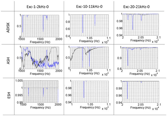 The coherence between the sensors and the PZT was computed for all the configurations tested. Figure 4 shows the coherence for the sensors installed in the rotating frame and for the three different excitation frequency bands while the disk was standing in air and in water (no rotation). It is seen that coherence is very good for the accelerometer located in the disk (ADISK) and for the AE sensor located in the shaft (ESH) for all the frequency bands, and in air and in water. The points with minimum coherence correspond to antiresonances of the disk [36], so they can be neglected. However, the accelerometer located in the shaft (ASH) presents different results for the lower frequency band (1–2 kHz), where the response of the structure dominates and, therefore, it is not coherent in this zone. For the higher frequency band (20–21 kHz) this accelerometer is coherent both in air and in water.