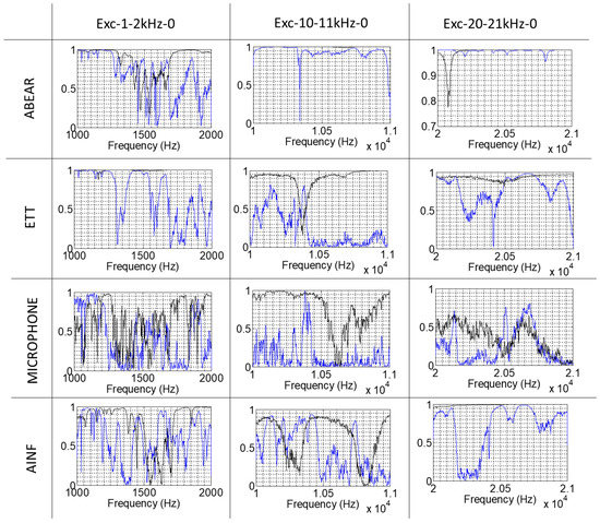 In this case, x(t) is any of the sensor signals and y(t) the excitation signal sent to the PZT. If this value is close to 1, both signals are coherent, which means that the signals acquired by the sensors are caused by the excitation of the PZT. A good coherence between the sensor and the PZT indicates that the transmission path is good. However, if the coherence is close to 0, it means that there is no linear causality effect between the sensor and the excitation signal and, therefore, in this case, it is not useful for the detection of erosive cavitation.