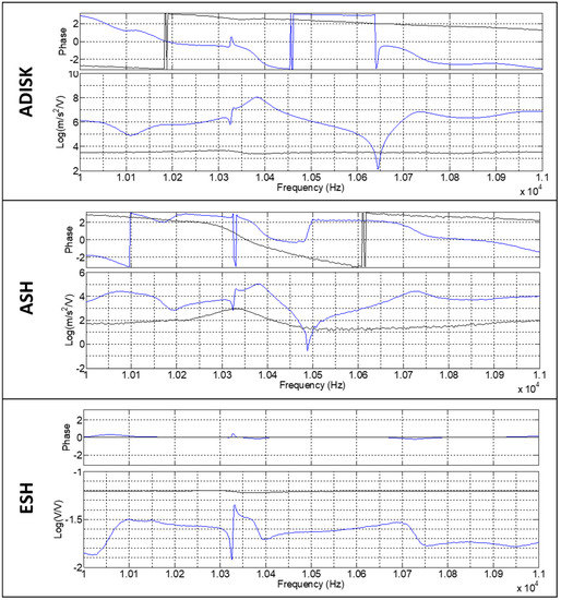 Figure 9 shows the results for the rotating sensors as well for the PZT. The results for the PZT give the information of the excitation for the different excitation patterns. The amplitude of the modulating frequency f1 is higher for the lower frequency band tested. This fact is due to the PZT characteristics, which behave differently at different frequency bands. Comparing the AE sensor in the shaft (ESH) with the excitation (PZT), the results are almost the same, which confirms that the EA sensor in the shaft represents very well the excitation in the disk. The cases where the rotating frequency was not found have been zoomed around the f1 in Figure 9. The accelerometers in the disk (ADISK) and in the shaft (ASH) give the same information than without any modulating frequency for the rotating frequency (ff), but adding the modulating frequency f1. In the case of the accelerometer of the disk (ADISK), this frequency (f1) is better seen in the frequency band of 10–11 kHz, whereas in the shaft it is better seen in the frequency band of 20–22 kHz. This is related to the frequency resonance of every accelerometer, which is different for this both cases.