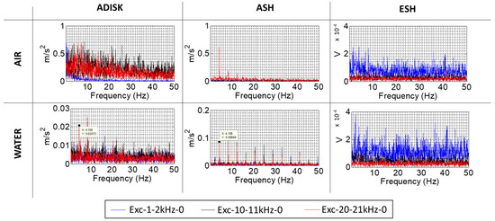 Figure 7 shows this amplitude demodulation analysis for the sensors installed in the rotating frame. It is observed that, for the accelerometer in the shaft (ASH), the rotating frequency is clearly seen for both cases in air and in water, and with greater amplitude in the case of the high-frequency band. The accelerometer in the disk (ADISK) also sees this rotating frequency, but only in the case of the water, where probably the misalignment of the rotating structures is higher. However, the AE sensor located in the shaft (ESH) does not capture this rotating frequency for any of the excitation bands tested. This is another proof that this sensor is not detecting the structural response of the shaft, but it is detecting only the excitation by the transmission of acoustic waves through the structure.