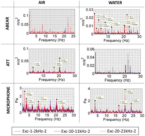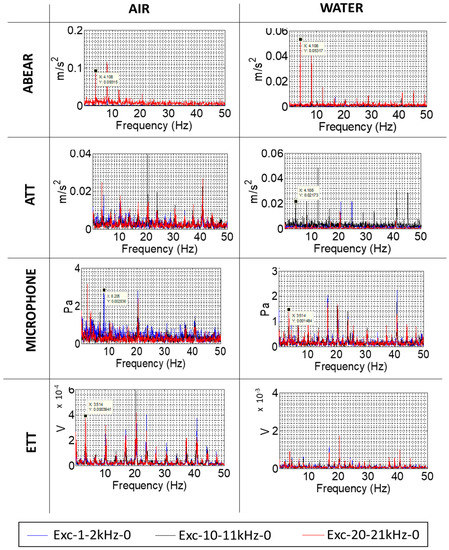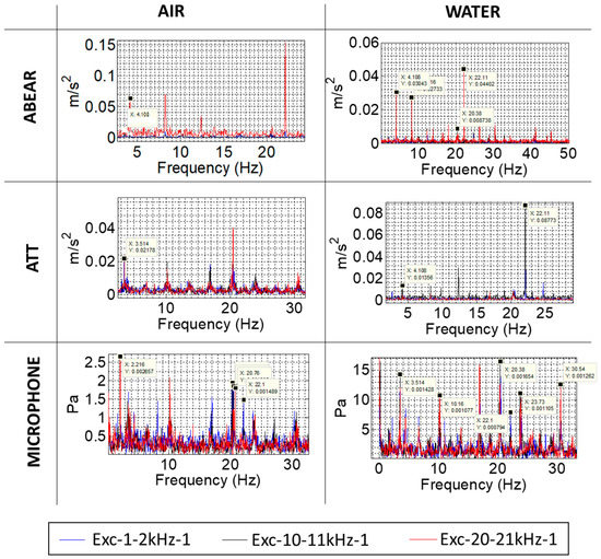 The results for the stationary sensors are shown in Figure 8. The accelerometer located in the bearing (ABEAR) presents similar results than the one located in the shaft (ASH in Figure 7): it detects the rotating frequency and its harmonics, especially in the high-frequency band (20–21 kHz). However, the rest of sensors from the stationary frame also detect the rotating frequency of the motor (20.5 Hz), its harmonics, and its subharmonics. This is because the vibration of the motor at its rotating frequency is also transmitted through the air and through the support, which is the same piece as the rest of the casing. Therefore, stationary sensors, especially the microphone and the AE sensors in the casing, in this case, are also affected by the motor vibration and not only by the vibration of the rotating part. This is a particular situation in this test rig, but it has to be considered for the analysis of the results. Even so, the accelerometer located in the casing (ATT) is able to detect the rotating frequency of the disk in the case of water for the excitation of 10–11 kHz, where the transmission is better through the liquid, as commented in Section 3.1.