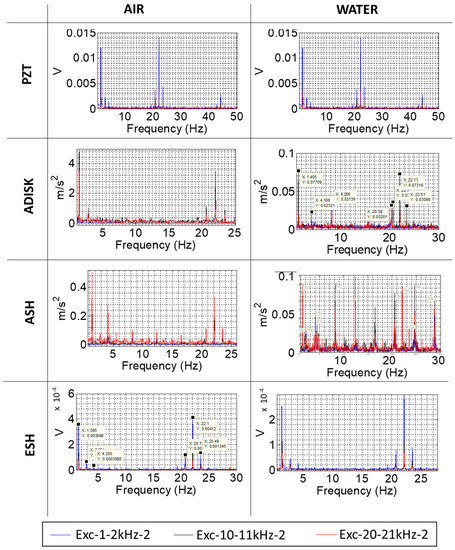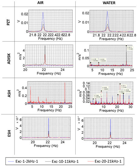 The results obtained for the analysis of the two modulating frequencies and the sensors of the rotating frame are shown in Figure 11. The conclusions here are almost the same than in the case of one modulating frequency: the AE sensor in the shaft (ESH) detects the excitation and not the response of the structure, the accelerometer of the disk (ADISK) detects both modulating frequencies but better in the range of 10–11 kHz, and the accelerometer of the shaft (ASH) is affected by vibrations induced by the motor when water is considered, and it detects the modulating frequencies better at 20–21 kHz. The main difference between one and two modulating frequencies is that near the f1 modulating frequency appear two other frequencies which correspond to f1 − f2 and f1 + f2, respectively. This has to be considered when analyzing complex systems with more than one modulating frequency, as in the case of a hydraulic turbine.