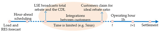 The proposed DR scheme is implemented in hour-ahead scheduling in a power system. The timeline for the hour-ahead scheduling and the proposed DR scheme is shown in Figure 1. In practice, for example, in California ISO (CAISO), the hour-ahead scheduling is provided approximately 75 min before the actual beginning of an operating hour while the load and RES forecasts are provided 2 h beforehand []. If the fluctuation of the RES results in an obstacle for conventional generators to adjust, the DR can be implemented to help with regulatation. In the process of DR, the LSE needs to broadcast the total rebate and the CDL to customers through social networks, and each customer claim for their ideal rebate ratio after a limited time, e.g., 5 min. LSE just needs to gather every DR customers’ claiming rebate ratio after this limited time to evaluate the total ideal rebate ratio of customers. As for customers, the claiming of the ideal rebate ratio corresponds to the regulation task. During this time interval, customers are able to exchange information with others to choose an optimal strategy and ensure their own welfare maximization. This process is modeled as a non-cooperative game and the Gossip algorithm is used to model the information exchanging process between customers, which will be described in Section 4. For the financial settlement, this paper assumes that each customer is trustworthy; thus, the settlement procedure will be completed by the LSE based on each customer’s claiming rebate, and customers will get the rebate in their social network account.