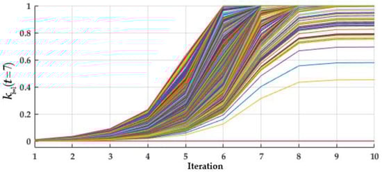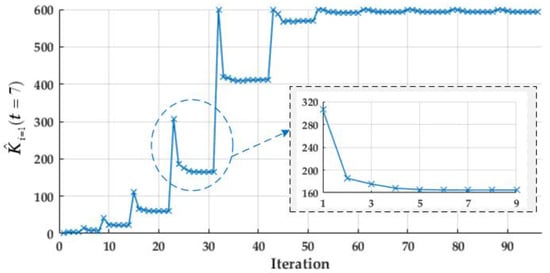 In the dynamic game process, it is very important for every customer to estimate the summary of all other customers’ strategy, that is, to estimate . Using our proposed Gossip algorithm, every customer just needs to exchange information with a few familiar customers through the social network and then everyone can get an accurate estimation value. Figure 10 illustrates one of the customer’s estimation value at the 7th time slot with the iterations. It should be noted that in the entire process, Algorithm 1 in the previous flowchart will iterate 10 times, while once is updated, the Gossip algorithm, i.e., Algorithm 2, should be executed to estimate the newest . The Gossip algorithm can converge into an accurate value in approximately 9 iterations.