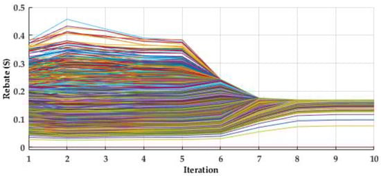 Every customer will receive the total rebate and the CDL, and after a limited time, for example, 5 min, it is required that the customer claims an ideal rebate value ratio , which is as much of a proportion of the total rebate the customer wants to obtained. It should be noted that every customer determines their rebate ratio greedily; however, after gathering all the rebate ratios, LSE will calculate the actual ratio for each customer, which ensures that the total rebate ratio will not exceed the “1”:
