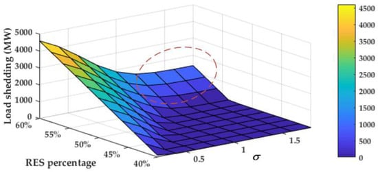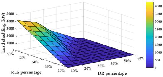 Additionally, we test the impact of RES percentage, DR percentage and total rebate value on load shedding. We assume RES can be consumed totally, and if there is too large a fluctuation of the pure load, the load shedding of customers has to occur to ensure frequency stability. First, we change the RES percentage at the 7th time slot from 40% to 60%. The DR percentage means the ratio of DR participants to all of the 3000 customers, which is changed from 10% to 60%, while the rebate rate factor . The simulation result (Figure 11) shows that a larger RES percentage leads to more load shedding because of the rapid random changing and limited generation’s ramp rate. On the other hand, a higher DR percentage means a larger voluntary and flexible adjusting capacity, which helps decrease load shedding and consumes RES. When the DR percentage is large enough, there will be no load shedding even if there is more RES. Then, the RES percentage is also changed from 40% to 60%, while the rebate rate factor changes from 0.2 to 1.8 but DR percentage is set as constant 20%. The simulation result is shown in Figure 12. When the RES percentage is not very high, the higher total rebate can play the same role as the higher DR percentage. However, in regard to a high RES percentage, increasing the total rebate cannot ensure zero (0) load shedding. This phenomenon is shown in the red circle in Figure 12 and means that in the high proportion RES integration power system, increasing DR percentage is very important but increasing rebates may not work well due to the regulation capacity limit of customers.