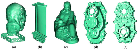 Normal vector estimation of several point cloud with the cube’s size 1.0L. (a) Famer Statue; (b) Blade; (c) Mother Statue; (d) Engine Cover; (e) Engine.