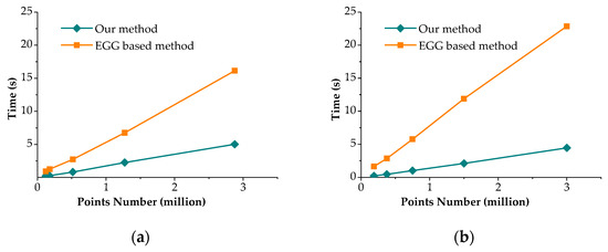 We tested the proposed algorithm and the EGG-based algorithm on the actual data and the simulated data, and plot the results in Figure 7a,b. The efficiency of the two algorithms is consistent with the data in Table 1. The average number of neighborhood points in our algorithm can reach 15, and Figure 7 shows the result that our algorithm is 3–4 times faster than the latter, and this is due to the fact that our algorithm requires less nearest neighbor searching and SVD operations. Once the length of cube’s edge L is determined, the projection points are determined, and the projection points are usually far less than 1/3 of the number of the points. Our algorithm consists of the following steps: create hash table, search hash table, Create 3D points, compute normal vector, and interpolation. The computation complexity are O(N), O(1), O(N), O(N), and O(N), respectively. The time complexity of our algorithm is O(N). We can get the same conclusion from Figure 7.