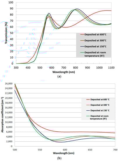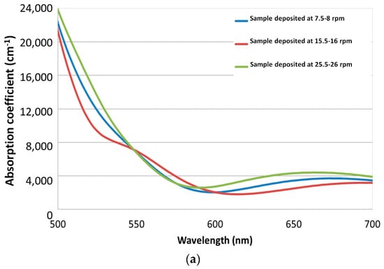In order to investigate the somewhat unexpected effect of substrate stage rotation rate on the MO properties of this type of garnet materials, we deposited three batches of films (named SS1, SS2, and SS3) onto quartz substrates using three different substrate stage rotation rates (7.5–8, 15.5–16, 25.5–26 revolutions per minute (rpm)). Substrate stage rotation is widely used in most (or all) physical vapor deposition technologies and is known to improve the area uniformity of the deposited film thickness. Relatively few studies reported so far in the literature have concentrated on uncovering other effects of substrate rotation rate on the functional properties of thin films, e.g., [21,22]. Initially, we did not expect the MO quality factor in magnetic garnets to be significantly dependent on the substrate stage rotation rate; however, it was found that an optimum rotation rate existed, at least for this composition type. For each batch of samples, all other deposition process parameters were kept identical. All three batches of samples were annealed in one annealing run using the best-identified annealing regime for garnet films of this stoichiometry type (6 h at 580 °C or, alternatively, 1 h at 670 °C), which was found by running multiple annealing experiments. The optical absorption coefficients were software-fitted using spectrophotometry measurement results across the entire visible spectral range (Figure 3a). There were significant (and initially completely unexpected) differences observed in the MO properties of films fabricated at different substrate stage rotation rates (in terms of the MO figure of merit); a summary of measured properties is shown in Table 2.