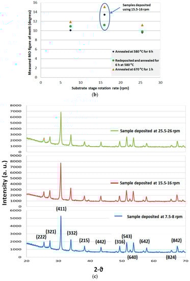 The bismuth content, as derived from the EDS datasets, within all deposited films in all experiments conducted at different substrate temperatures and rotation rates varied between 1.75 and 1.9 formula units. The specific Faraday rotation and the optical absorption coefficients at 532 nm were determined to calculate the MO figures of merit in Figure 2. After annealing, it was observed that the samples prepared on quartz substrates at room temperatures showed better MO properties (the highest Faraday rotation and MO figure of merit, as summarized in Table 1) at the 532 nm wavelength, though all of the annealed garnet films had relatively high absorption coefficients at 532 nm. It has also been noted that the absorption coefficient increased at very high substrate temperature (e.g., 600 °C) in Figure 2b, consequently reducing the MO quality (figure of merit) of the garnet layers. However, the films deposited at a higher temperature showed comparatively lower coercive force values. The lowest coercive force, of about 100 Oe, was measured for films deposited at 300 °C. The XRD datasets in Figure 2c obtained from the annealed garnet layers deposited at different substrate temperatures show sharp and well-defined diffraction peaks, indicating good crystallinity of the materials synthesized. In addition, it can be seen clearly that comparatively stronger diffraction peak intensities were observed in films deposited at room temperature, and the peak intensities tended to become weaker with increasing substrate temperature. The higher peak intensities may relate to obtaining increased volumetric fraction of the crystalline garnet phase present in these samples, which can also be related to higher MO performance observed in samples deposited at room temperature. The elemental composition data, represented as measured element concentrations in atomic %, collected from the as-deposited garnet films prepared at different substrate stage temperatures are summarized in Figure 2d. The Bi content, compared with the nominal stoichiometry of the sputtering target, was found to vary, owing to the varying loss of Bi atoms during the film growth process, in all garnet samples. The exact ratio between Fe and Ga contents in terms of atom numbers per formula unit (f.u.) was also found to be slightly different from the ratio estimated. A larger-than-expected (>60 atomic %) oxygen content measured in all films indicated some experimental errors originating from the oxygen atoms being either present within the substrate pores or trapped within the film pores. For the amorphous-phase garnet-type layer, deposited from a metal-oxide mixed sputtering target of nominal composition Bi2.1Dy0.9Fe3.9Ga1.1O12, only the volume-averaged composition of films could be derived (Table 1) from the obtained EDS data. The experimental results summarized in this section can be used as a guide for depositing new garnet-type thin-film materials with high MO performance.